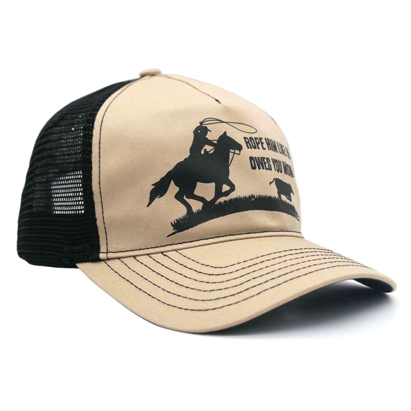 Бейзболна шапка в цвят каки, изработена от туил  (60% памук, 40% полиестер) и мрежест гръб,с щампа с надпис „Rope him like he owes you money“ (Хвани го с въже така, сякаш ти дължи пари)