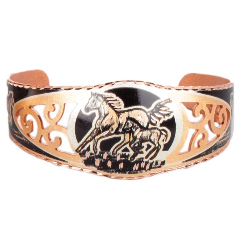 - Медна гривна с дизайн на кобила и жребче впечатлява с филигранни ажурни орнаменти и посребрена, диамантено гравирана повърхност, защитена с прозрачен лак.
