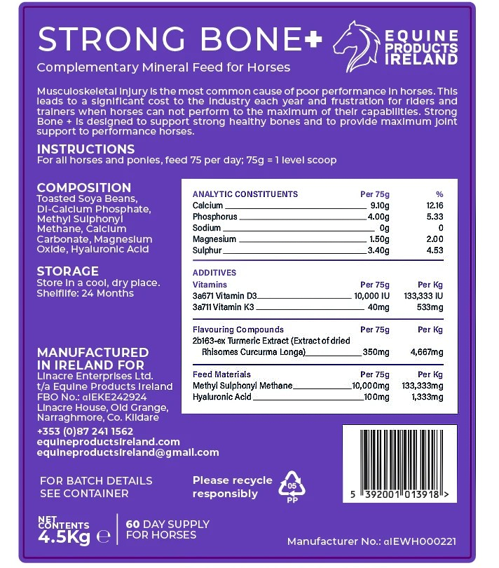 Разработен, за да поддържа костите здрави и силни и да осигури максимална подкрепа за ставите при спортни коне. Добавя се в храната по 75грама на ден.
