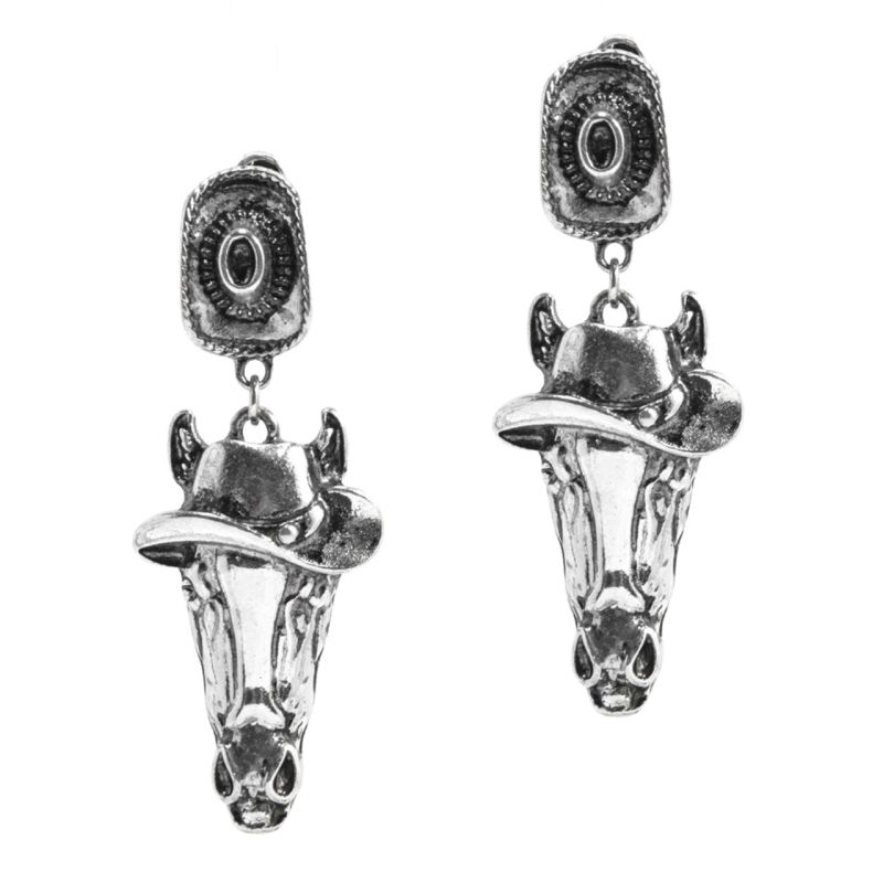 Добавете нотка уестърн чар към визията си с тези висящи обеци с конска глава. Изработени с лъскаво сребристо покритие, тези обеци изобразяват детайлна конска глава с каубойска шапка, съчетавайки рустик стил с удобство за ежедневно носене